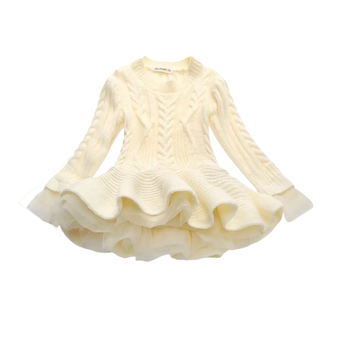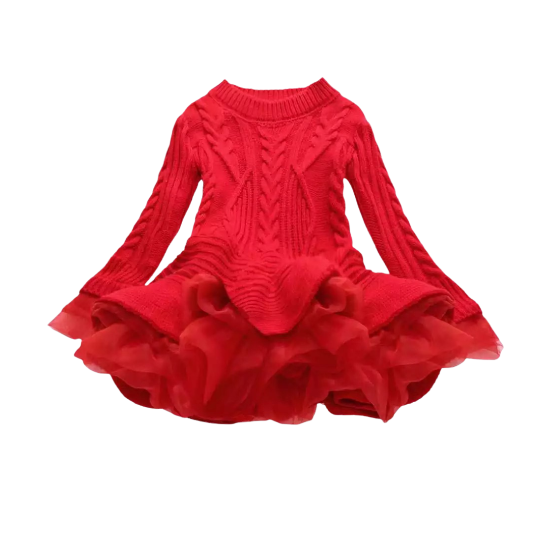 Our Girl’s Knitted Sweater Dress chic design combines a soft, knitted top with elegant layered ruffle details for the skirt and sleeves. The intricate cable-knit pattern adds texture, while the lightweight chiffon layers provide a playful, feminine touch.