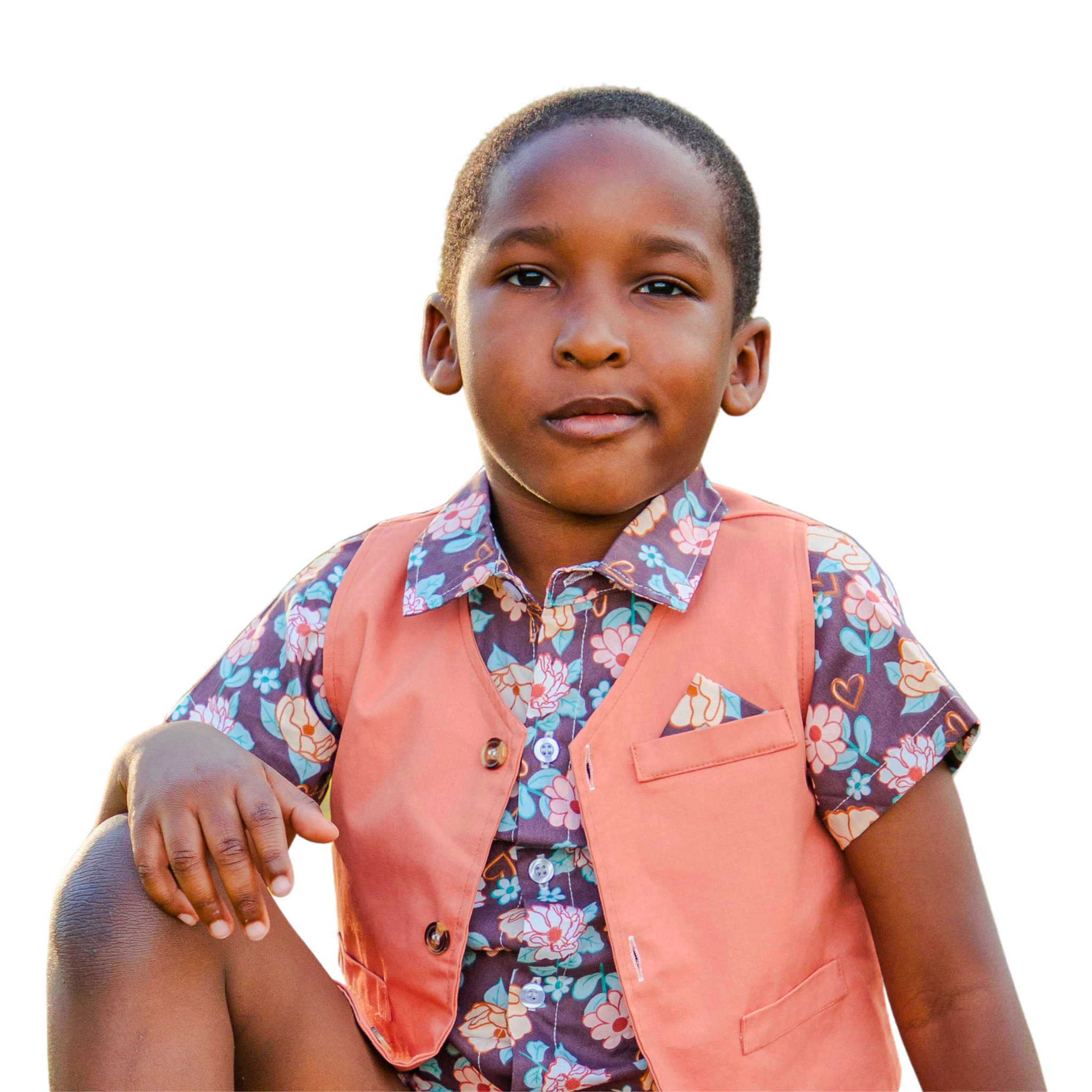 Featuring a playful short-sleeve floral button-down shirt, a sharp peach vest with wooden buttons, matching shorts, and adjustable suspenders, this set combines charm and comfort effortlessly. The included bow tie adds a touch of elegance, making it perfect for casual summer events or special occasions. “Spring Time Cutie”